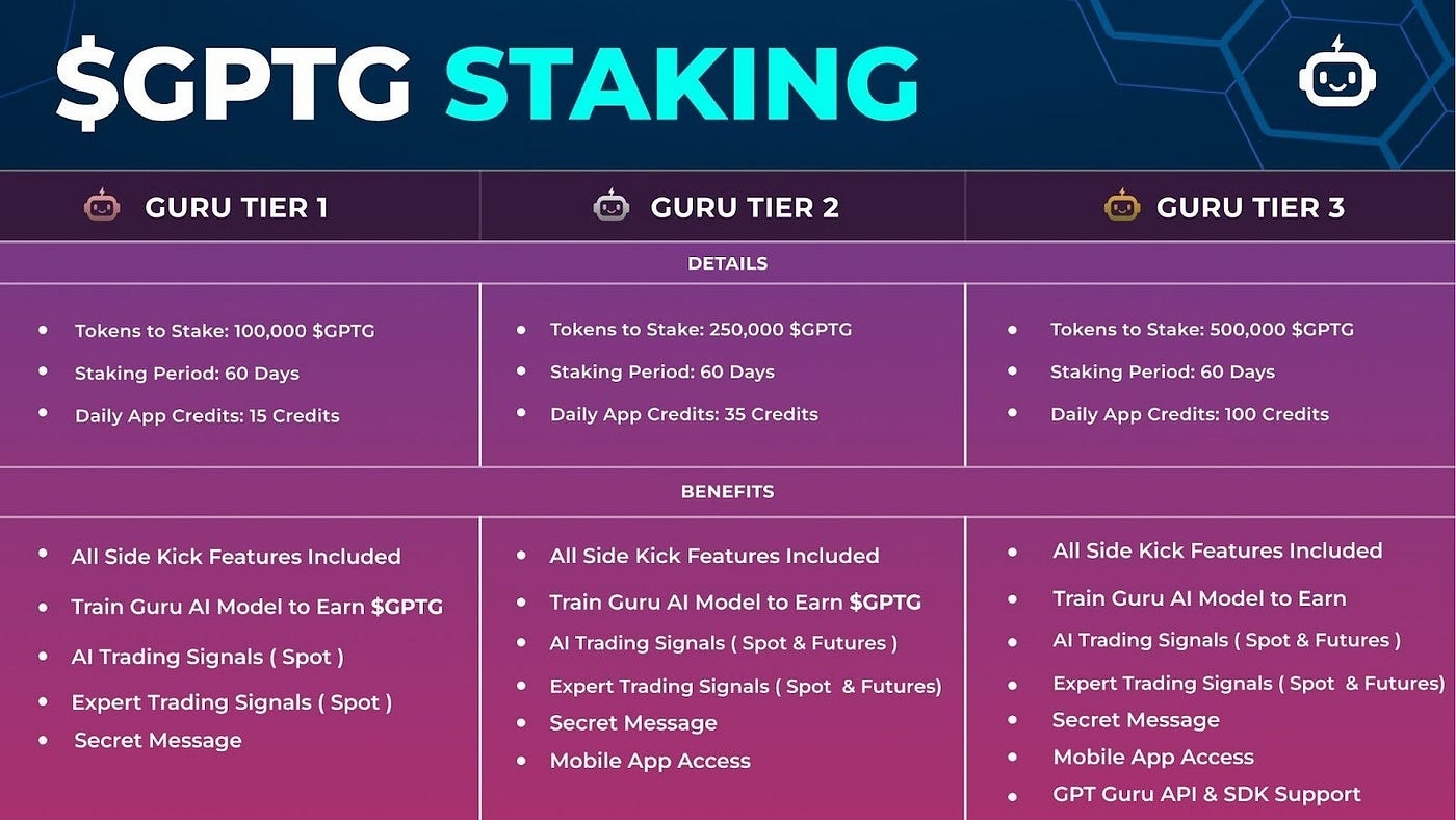 Staking tiers have been defined in order to facilitate the Guru community to avail the GPT Guru AI-powered features and opportunities as per their preferences.